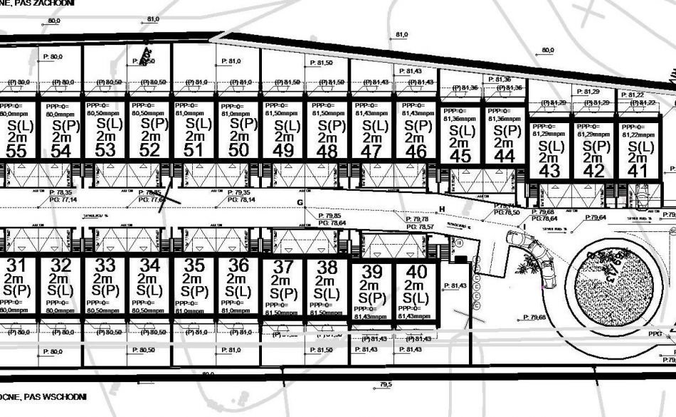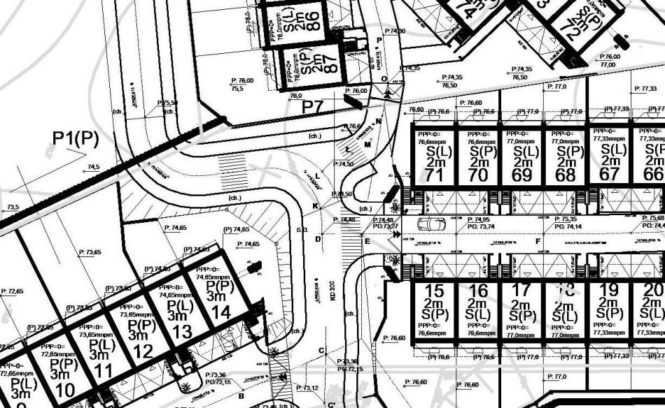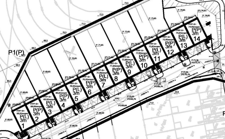 Pochylnię podjazdu o dość dużym 22,5%-wym spadku zaprojektowano jako konieczność dla tak wysokiej, skompensowanej powierzchni. Skompresowana powierzchnia to nie tylko większy zysk dewelopera, ale również i ze względu na największą ilość budynków zysk dla samych mieszkańców. Wysoka ilość budynków na jednej działce pozwoli ograniczyć bardziej wydajny swą ekonomicznością koszt wybudowania osiedla. Spadek ten zaprojektowano jako i tak daleki od maksymalnych dopuszczonych warunkami technicznymi parametrów. Dla komfortu i bezpieczeństwa użytkowania pochylni architekci zaprojektowali umieszczenie pod ich powierzchnią zespół mat grzewczych, które pozwolą na możliwie wygodne w tych warunkach ich użytkowanie również w zimie. Maty grzewcze projektuje się jako załączane samoczynnie poprzez standardowy mikroporcesor analizujący parametry spadku temperatury i wilgotności i włączający grzanie nad ranem daleko przed zaprogramowanym statystycznie momentem wyjazdu z garażu. Dla ograniczenia kosztów użytkowania maty grzewczej zostanie ona umieszczona wyłącznie pasami pod wyznaczonym torem kół samochodów.